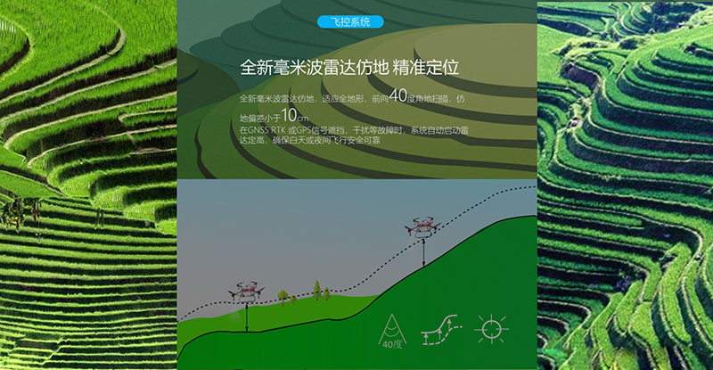 可扩展升级毫米波或激光测距模块,使飞行过程保持机体与农作物之间处于相对稳定的高度,避免由于地势起伏变化造成喷洒高度改变而导致的药量扩散,提高药量喷洒的精准性,有效提高航空植保作业效果,与农业APP配合使用,可通过精准的航线规划,避开作业区域内的障碍物,飞行轨迹高度精准,避免植保作业的重喷漏喷现象,满足高精度作业需求。