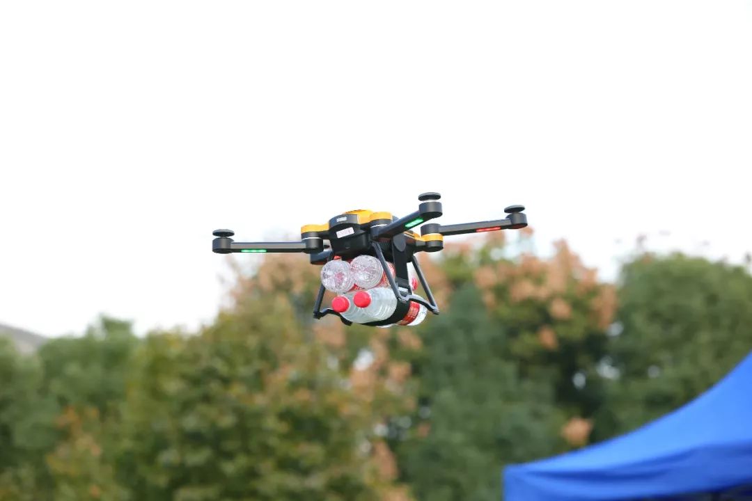 (无人机载着4瓶矿泉水进行飞行演示)