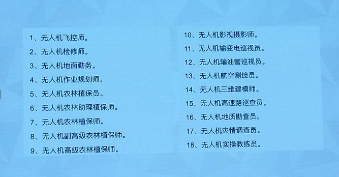 据统计分别有:无人机飞控机、检修师、地面勤务、作业规则师、农林植保员、农林助理植保师、农林植保师、副高级农林植保师、高级农林植保师、影视摄影师、输变电巡视员、油管巡视员、航空测绘员、三维建模师、高速路巡查员、地质勘查员、灾情调查员、实操教练员。