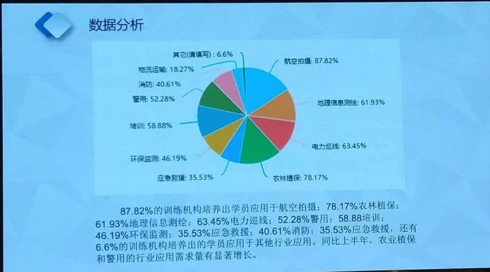据统计分别有:87.82%的学员应用于航空拍摄;78.17%农林植保;61.93%地理信息测绘;6345%电力巡线;52.28%警用;58.88%培训;46.19%环保监测;35.53%应急救援;40.61%消防;35.53%应急救援,还有6.6%的应用于其他行业应用。同比上半年,农业植保和警用的行业应用需求量有显著增长。