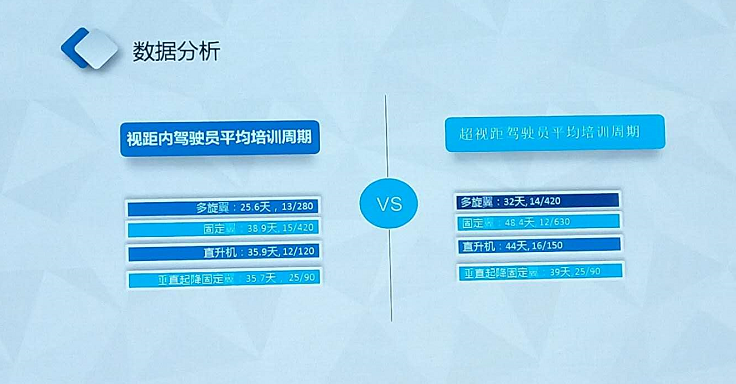 据统计目前全部视距内驾驶员(即驾驶员)平均培训周期,多旋翼为25.6天,固定翼为38.9天,直升机35.9天,垂直起降固定翼35.7天;