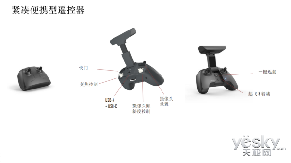 采用折叠设计的还有PARROT ANAFI操控器--Parrot Skycontroller 3遥控器,它同样具备小巧便携的特点。如果说PARROT ANAFI的机身重量仅有一副羽毛球一般,那么386g的遥控器也丝毫不会增加手部负重。