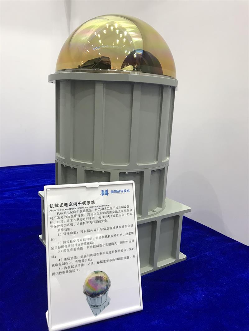 机载光电定向干扰系统利用激光的高亮度特性,用定向发射的高能量激光束照射目标,对其正常工作状态进行干扰,使目标失去定位方向,可有效保护各类客机、战机等飞行器的安全。