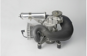 Laofeng 80C Engine:曲轴的一端配置有结构紧凑占用空间小的强磁100W发电机、超越式电启动、点火触发等机构。该发动机铝制曲轴箱为卧式设计,与气缸成180度的对面设置为发动机的进气口和化油器固定位置,化油器的中心进气轴线与气缸轴线成60度夹角,采用该夹角设计的发动机总厚度非常低,适合要求占用空间小或安装空间有限的器材或设备上使用,是无法被替代的一款优秀布局的发动机。气缸排气口设计成与曲轴轴线平行的设计方式,更加有利的减小了发动机安装后的整体占用空间和高度。