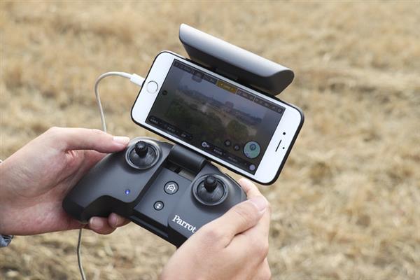 从图片上可以看出,Anafi无人机可借助智能手机作为监视屏幕,不过需要通过手机充电线连接遥控手柄,但却并没有专用的连接线,使用起来多少还是有些不便。