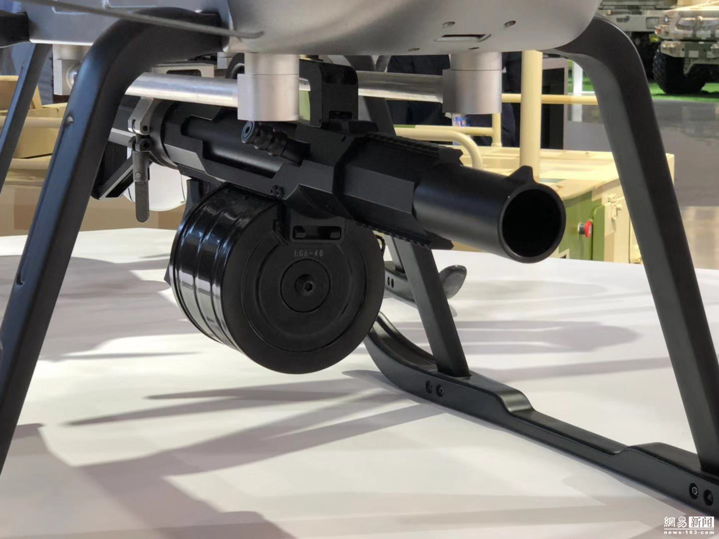 蜂群无人机系统。比普通家用无人机稍大,下挂榴弹发射器。