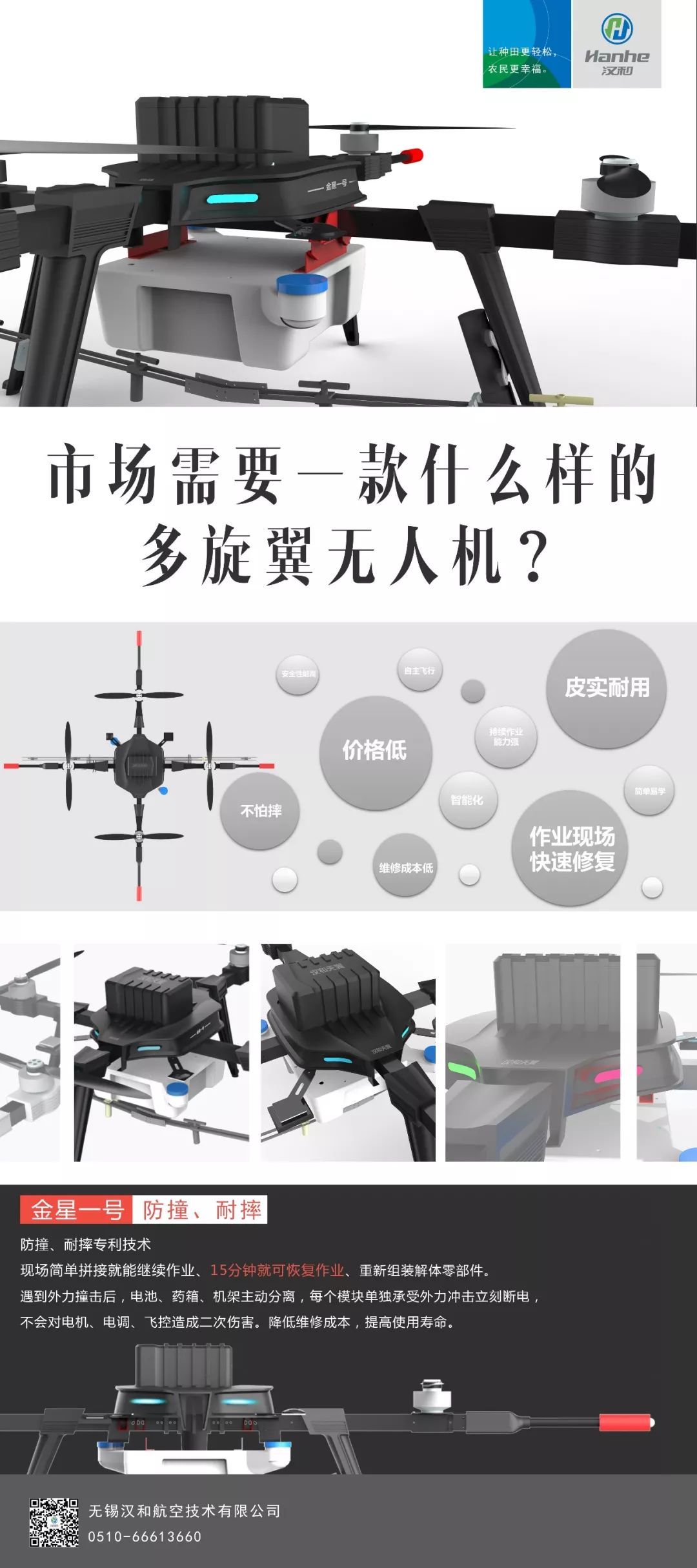 调研活动期间,领导一行还参观了汉和金星一号电动多旋翼植保无人机。金星一号是汉和在2018年初推出的工业级植保无人机。简单上手快、效果好、快速维修、维修成本低已然成为公认的亮点,进入市场后得到多方认可。
