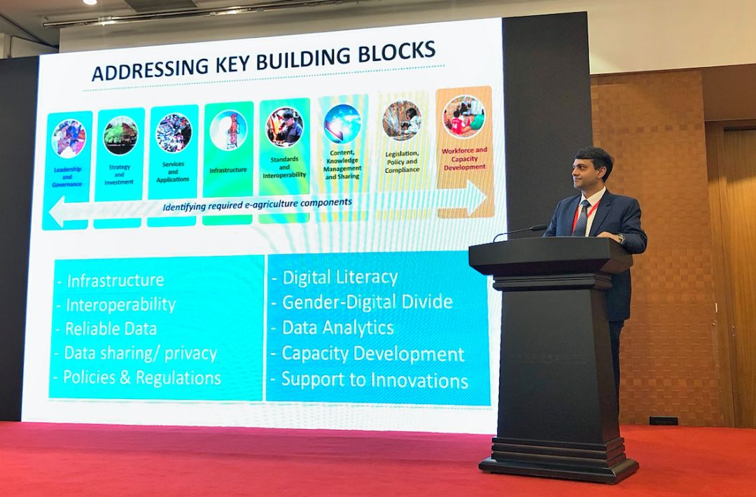 国际粮农组织官员 Gerard Sylvester、国际电信联盟官员 Ashish Narayan 在可持续农业信息通信技术和全球趋势的联合演讲中表示,数字农业与创新应用、可持续农业信息通信技术是提高生产效率的关键。将知识创新渗透到农业的方方面面,将电信服务、信息服务、IT 服务及应用与现代化农业设备联动起来,才有可能在未来解决 90 亿人口的粮食问题。