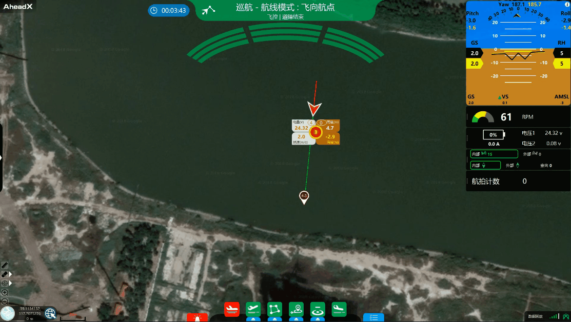 AheadX-多旋翼视觉避障系统使无人机拥有稳定的实时深度感知能力,作业过程中当双目避障模块检测到距障碍物距离小于预置的“避障距离”参数时,飞控将会自动进入“避障模式”,持续检测障碍物信息并爬升以脱离障碍物,直至前方无障碍物后继续执行任务。整个过程全自动执行,无需人工干预,全面提高多旋翼无人机超视距作业过程中的飞行安全性。用户将飞控升级到2.6.9及以上版本,将Space V3地面控制软件升级到3.0.29及以上版本即可配合硬件使用避障功能,并可根据机体尺寸自行使用Master软件配置安全通行宽度和高度等避障参数。