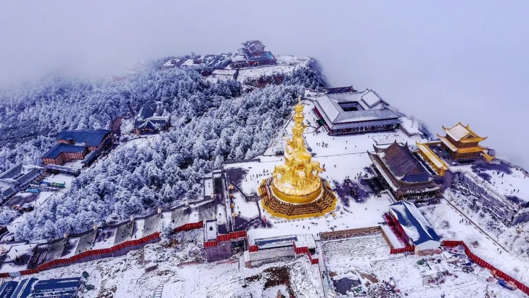 雪后的峨眉,肃穆是它的主题。曾经烟火缭绕的朱红色殿宇里被覆盖上一层白色的禅意,金色的像尊在白雪的衬托下变得更加庄重。雾气缭绕在山顶,来往的游人在无人机的航拍镜头下都变得非常渺小,此刻画面中只剩下庙宇的壮丽。