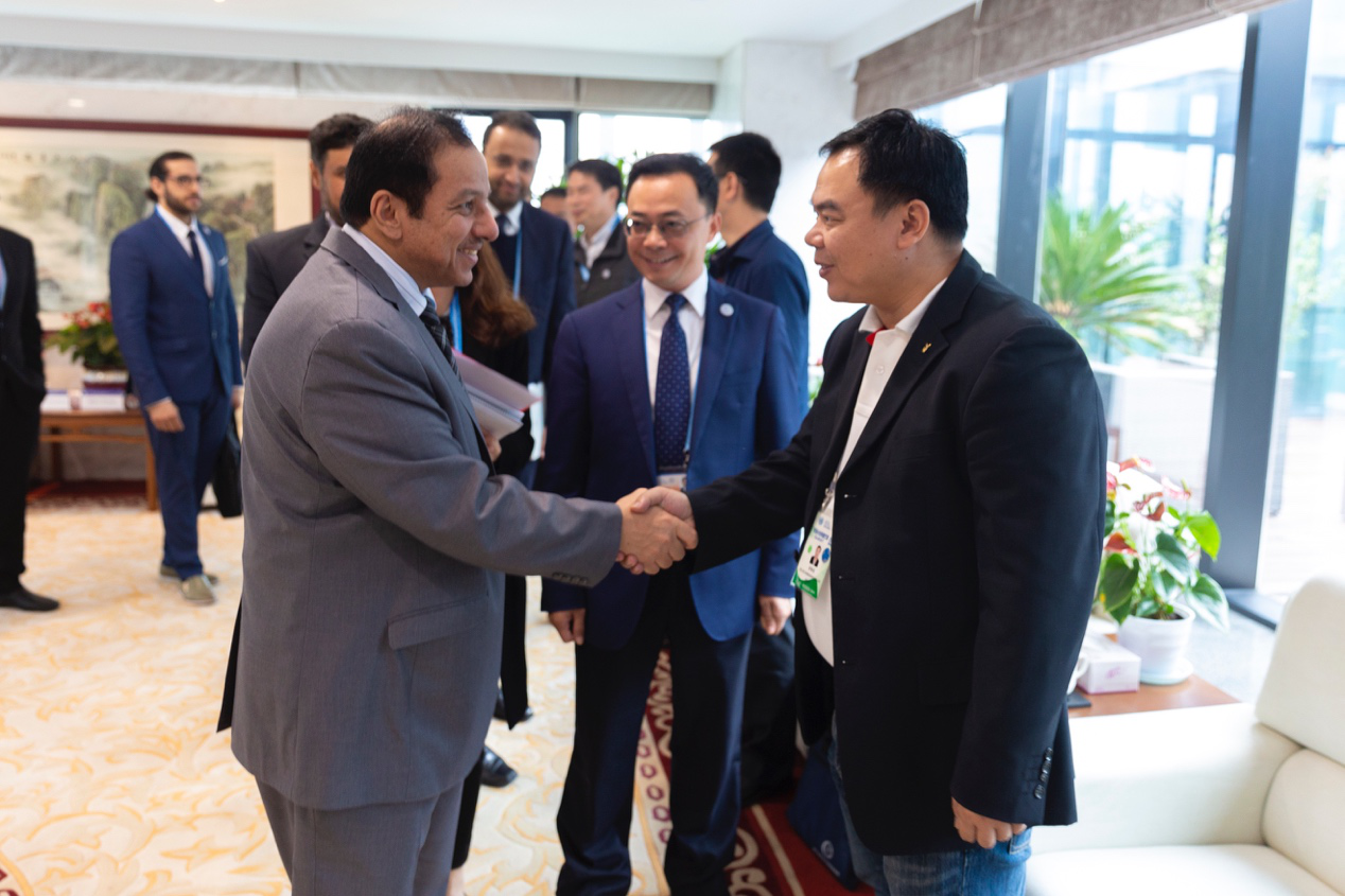 (沙特阿拉伯测量委员会副主席班达尔•穆斯曼尼(Bandar Al-Muslmani)与极飞地理总经理游春城亲切握手)