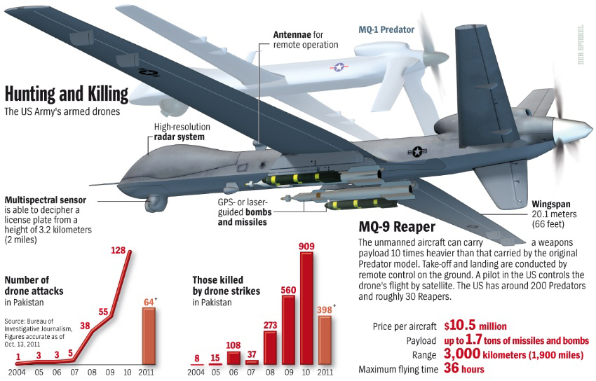资料图:图为美媒报道的美军MQ-1"捕食者"(Predator)无人机与MQ-9"死神"(Reaper)无人机对比示意图。