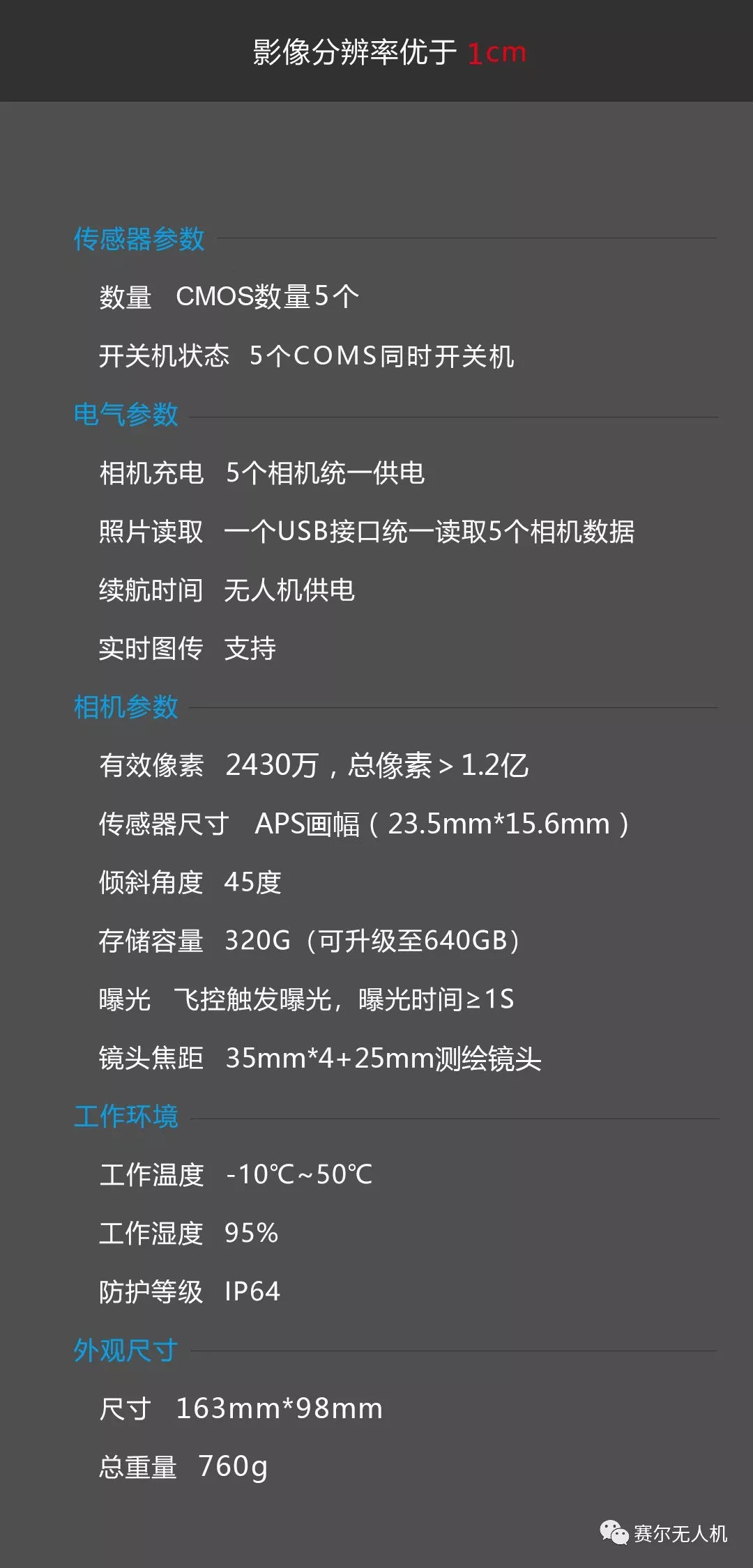 我公司自主研发的SHARE-101S,APS画幅,像素大于1.2亿。由五个COMS同时曝光采集数据,操作性(平板地面站系统/军工地面站系统,规划航线,一键作业,自动起降),稳定性(军工级飞控,安全稳定,断桨保护,电压保护),作业精度(自带POS信息,RTK/PPK差分定位系统)。
