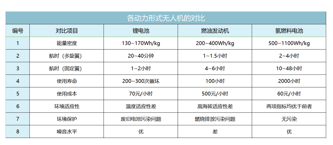 此外,锂电动力无人机抗低温性差;燃油动力无人机高海拔适应性差;燃油发动机保养周期短,维护麻烦。而氢燃料动力电池工作温度范围更广,高海拔适应性强,后期保养维护简易。另外,从环保角度来看,废旧锂电池对环境影响很大,而燃油发动机工作会产生废气排放,并且燃油存在着火风险,引发次生灾害。氢燃料电池只会产生水和热,整个循环就是彻底的不产生有害物质排放的过程。更重要的是,锂电池的充电效率低,锂电池循环寿命短,实际费用高;燃油发动机保养周期短,维护费高,但是氢燃料电池无人机的综合成本会显得更低。