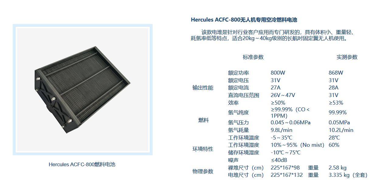 800W空冷燃料电池,具有体积小、耗氢率低等特点,适合20kg~40kg级别的长航时固定翼无人机使用