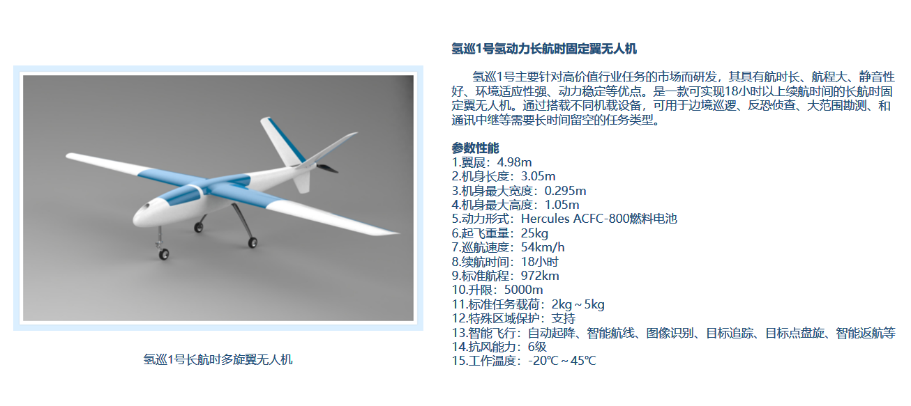 FCFW-1氢巡1号,有效载荷2kg~5kg以上,续航18小时以上的氢动力固定翼无人机