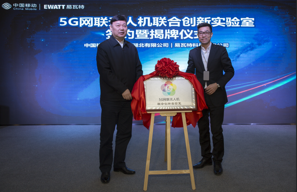 湖北移动董事长范秉衡与易瓦特股份公司董事长赵国成为5G网联无人机联合创新实验室揭牌。