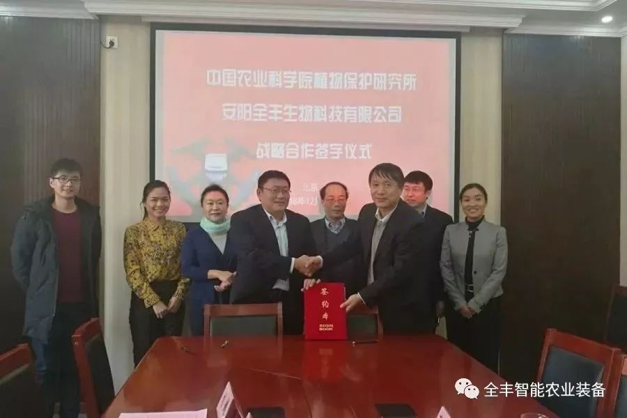 2018年12月14日,安阳全丰生物科技有限公司董事长王志国一行到中国农业科学院植物保护研究所,就我国精准农业与航空植保所关注的热点问题,如植保无人飞机作业规范、航空药剂研发、精准施药技术等方面开展全方位的合作达成协议。战略合作签约仪式在中国农业科学院植物保护研究所行政楼会议室进行。