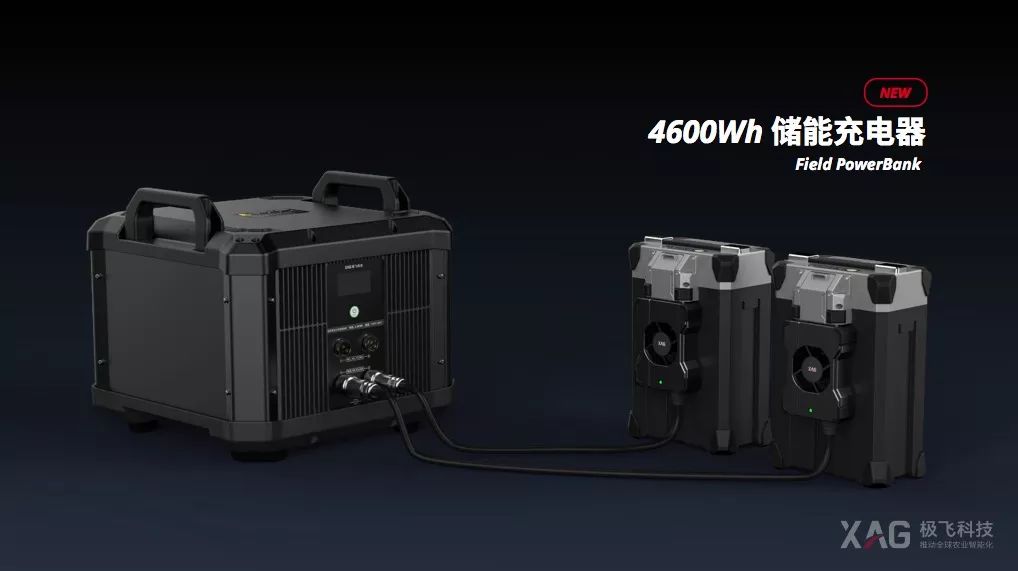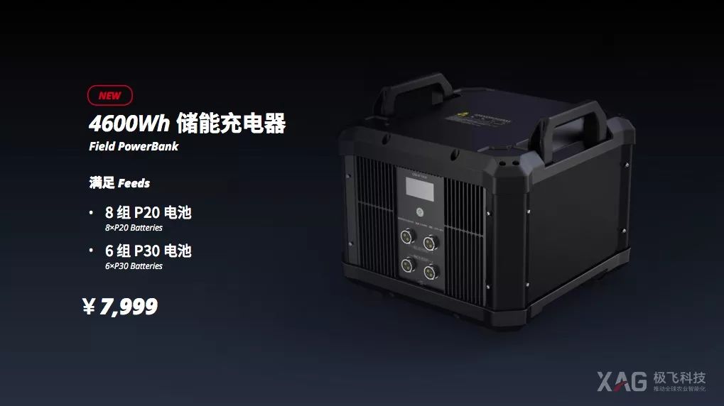 为此,我们发布了全新的储能快速充电器,能够储能4600wh,可充满 8 组极飞智能电池。无论静止或在驱车转场途中都可充电。内置两路充电单元,可同时给两组电池快速充电,每组仅需 20-30 分钟,大大提高了转场作业的效率。而用户在农村给这样的储能充充电的成本大约为0.6元每度,每亩的电力成本只需0.06元(以P20 每一度电作业10亩为例)。