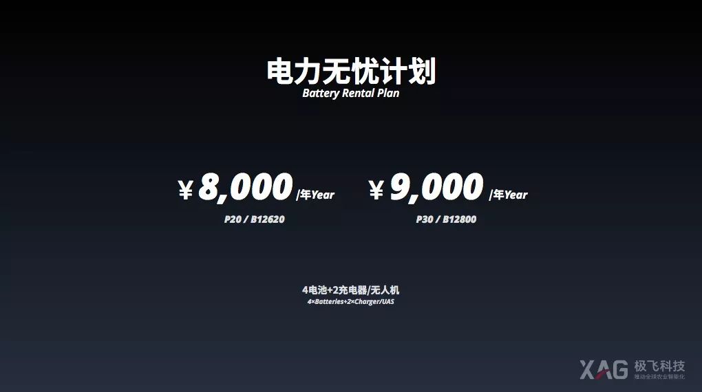 基于 P 系列 2019 植保无人机智能电池系统的创新优化,我们推出了全新电池保障方案——“电力无忧计划”。用户只需花 8000/9000元 的租赁费用,就可以不限次数全年无限使用电池,相当于一年只需花8000/9000元就可以满足全年作业电池需求。