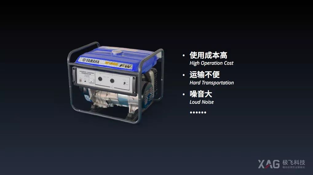 我们发现,用户在田间作业时常使用发电机给电池充电,不仅噪音大而且转场、加油都比较麻烦,发电机维护使用成本也很高,一台汽油发电机的使用成本大概在每亩地 0.2-0.3 元。