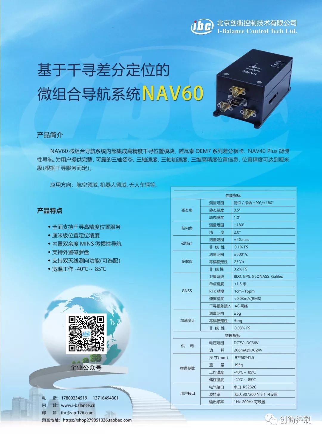 创衡控制基于千寻差分定位推出微组合导航系统NAV60,内部集成高精度千寻位置模块、诺瓦泰OEM7系列差分模块、NAV40 Plus微惯性导航模块。为用户提供完整、可靠的三轴姿态,三轴速度,三轴加速度、三维高精度位置信息,位置精度可达到厘米级(根据千寻服务而定)。广泛应用于航空领域,机器人领域,无人车辆等。
