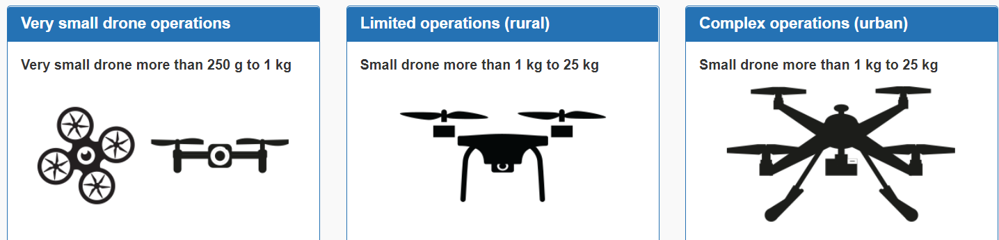 拟议的规则引入了三类无人机。每个类别都基于设备的大小,飞行员以及无人机的操作位置。新要求针对每个类别: