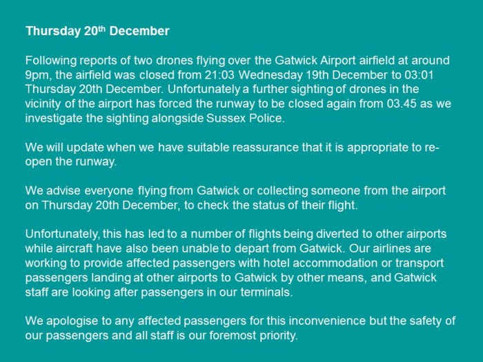 盖特威克于周三晚上9点左右首次关闭,于周四凌晨3点左右重新开放,但在无人机被发现的45分钟后再次关闭。