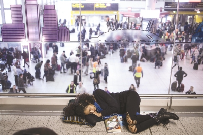 盖特威克机场被迫关闭后,滞留旅客只好在候机室地面上暂时休息。 视觉中国