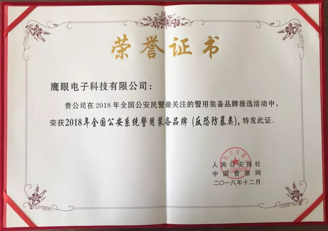 在2018年12月26日举办的2018(第七届)全国公安民警最关注的警用装备品牌颁奖仪式暨全国警用装备品牌发展研讨会上,“鹰眼”被评为2018(第七届)全国公安民警最关注的警用装备品牌。