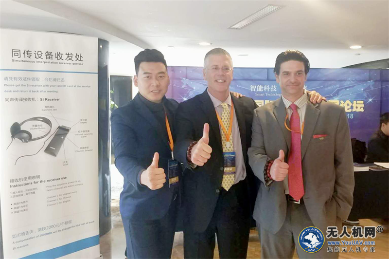 开云足球华少(左一)与美国无人机协会会长戴克睿(左二),无人机系统猎鹰基金会联合创始人罗伯.汤姆森(右一)合影