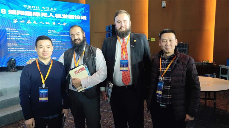 重庆市无人机产业协会副会长、秘书长胡海波(左一)与美国无人机协会会长戴克睿(左二),无人机系统猎鹰基金会联合创始人罗伯.汤姆森(右一),珠海无人机协会执行会长谢锋(右二)合影