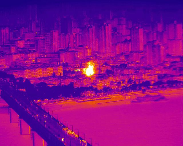 夜间及雨水天气,遇水可燃物质和化学品情况会变的很复杂,黑暗环境下,无人机热成像传输系统成了提供信息的关键性工具。高性能图像传输系统可以实时传输红外热成像的影像,进而测绘出场景的温度信息,给消防指挥人员提供强有力的决策支撑。现场明火扑灭后,无人机挂载热成像仪进行巡视,确保温度稳定无安全隐患后,消防人员可以撤离现场。