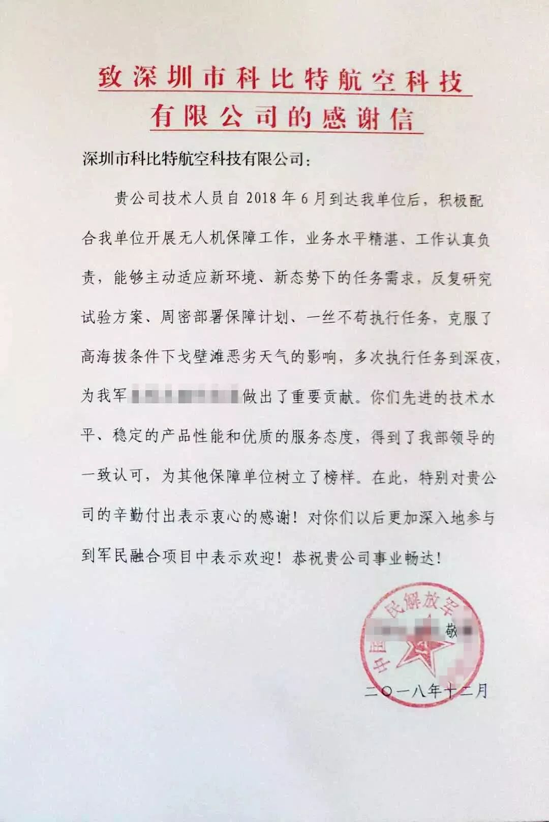 近日,科比特航空收到了中国解放军某部队发来的一封感谢信,信中主要表达了对科比特航空的技术水平、产品性能及服务态度的认可与肯定,同时希望科比特航空能继续深入参加军民融合项目。