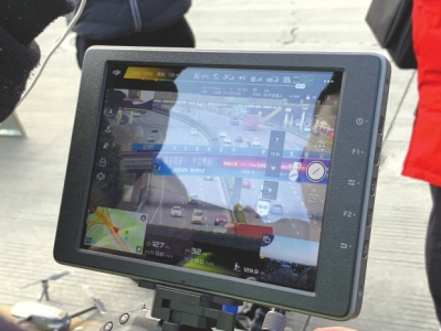 11点40分,第三架无人机飞入空中,这也是“空中电子眼”队伍里最大最先进的一台无人机。它配备有30倍光学变焦的摄像头,还安装了喊话器,民警可远程对事故现场进行处理。在指挥器上,可以清楚地看到道路状况,“这架无人机可以在40米的空中,将100米以内的车辆车牌看得一清二楚。”