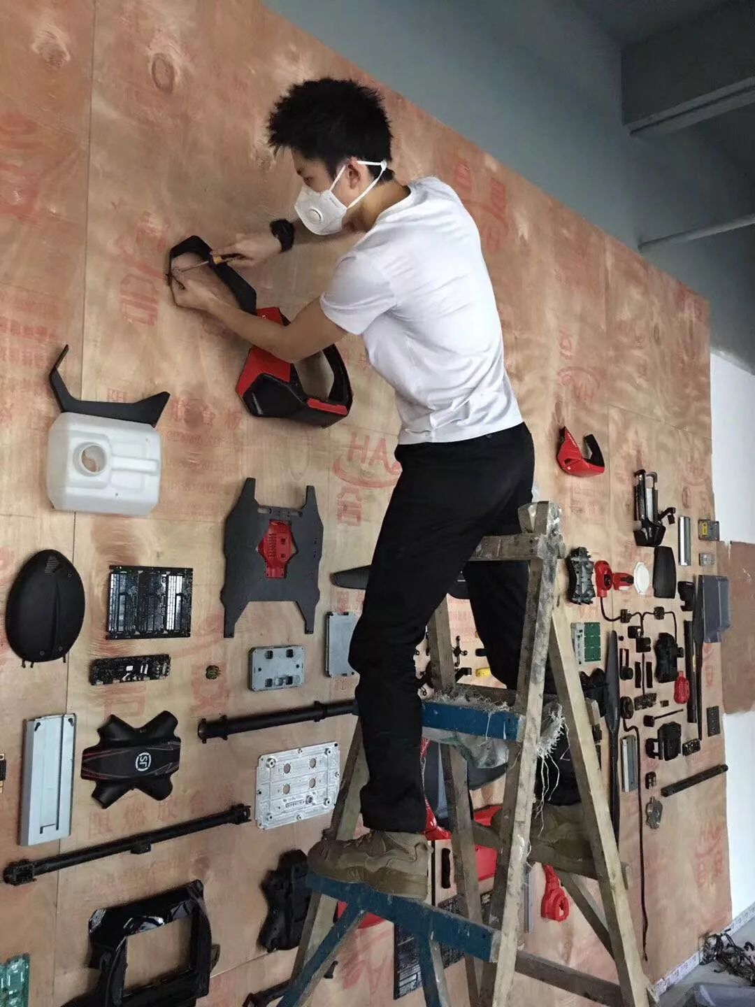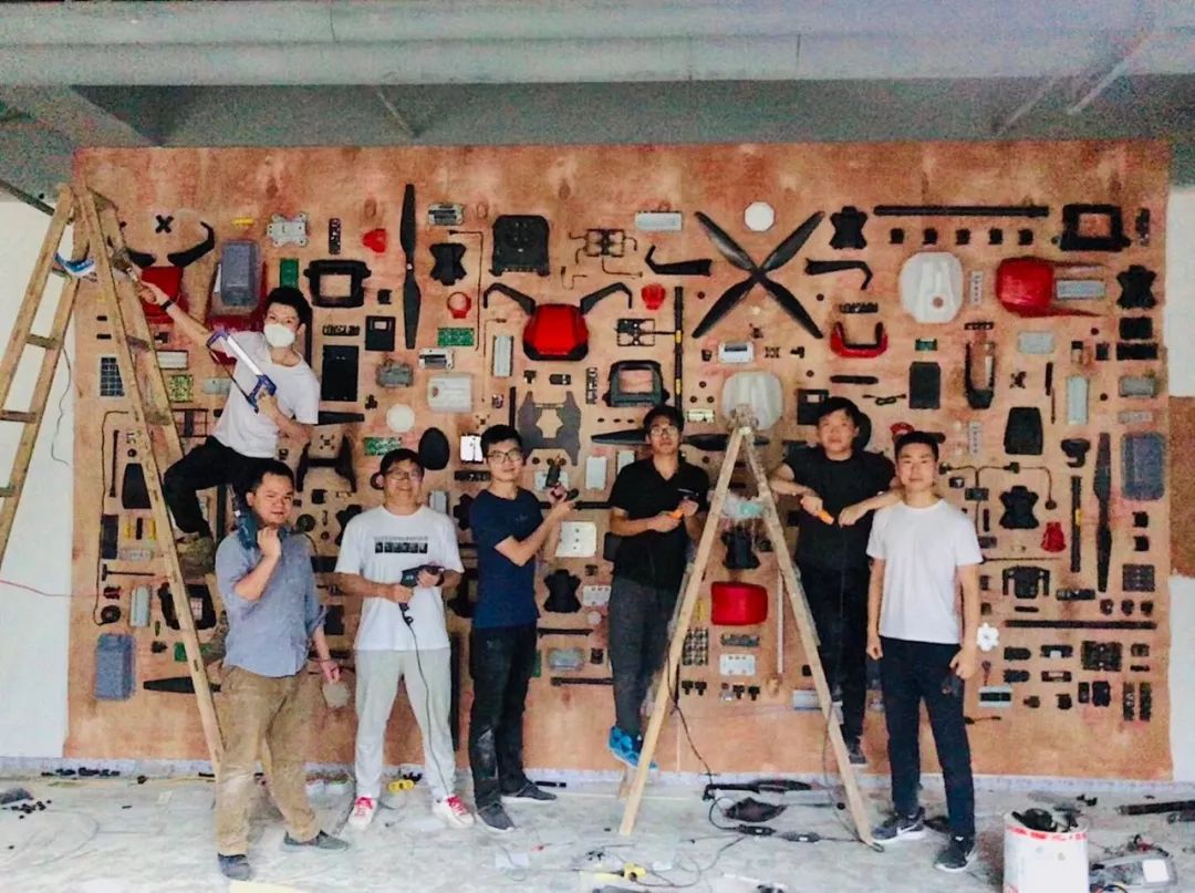 零件到手后,我们的设计师们花了一周时间,将这些极飞设计和生产史上重要的飞行器部件,镶嵌在了研发中心门口的这面墙上。上面有 2010 年极飞转战农业科技领域前生产的X650 的头壳,也有 2017 款 P20 的身影。