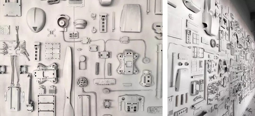 浮雕墙的创意,来自于极飞的联合创始人龚槚钦,他带着品牌部的同事去到了极飞东莞的制造工厂,(照)挑(单)选(全)了(收)十几箱“上墙”的零部件。