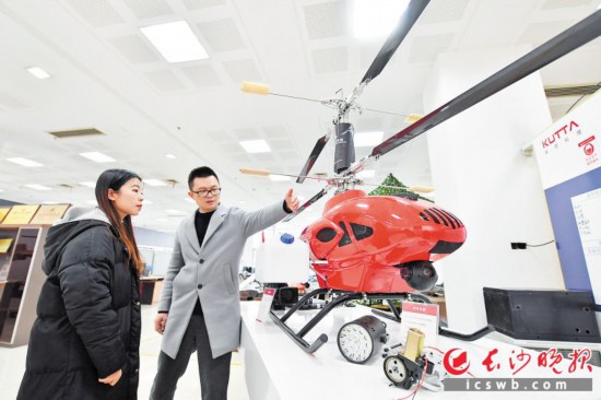库塔科技位于长沙经开区三一众创三楼,在其公司的进门两侧,各摆放着一架红色共轴无人直升机。这两架直升机最特别之处就是采用了双桨共轴的动力模式。记者近距离观察发现,直升机顶部有着复杂的共轴机械结构。“相比单旋翼带尾桨的直升机,这种飞机抗风能力更强;相比多旋翼直升机,我们的飞机有更长的续航。”黄佳维说,这是他们目前研发出的两款机型,载荷分别为30公斤和50公斤,均可在7级风中正常工作,每小时最高速度可达120公里。