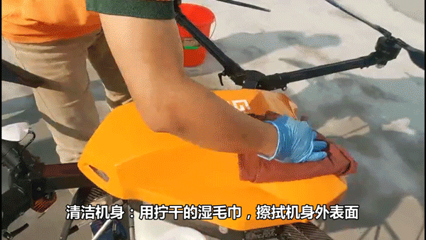用拧干的湿毛巾,擦拭机身外表面,包括桨叶、机臂、电机座、喷杆、机身盒、脚架、连接杆、药箱外表面。