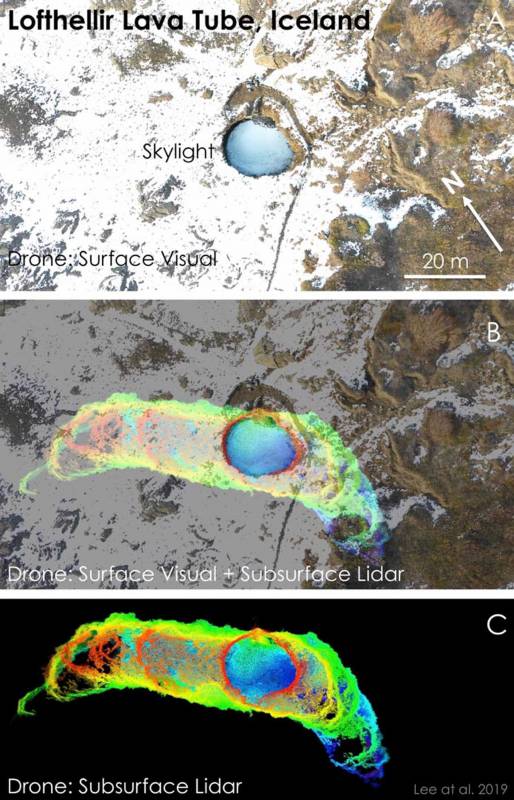 SETI研究所和Astrobotic Technology公司宣布他们已经使用配备激光雷达系统的无人机探索冰岛熔岩管内部。富含冰的熔岩管位于冰岛偏远的Myvantn地区。配备激光雷达的无人机能够记录形状和范围,探索这种岩石“瀑布”的历史,以及管内冰的形成。