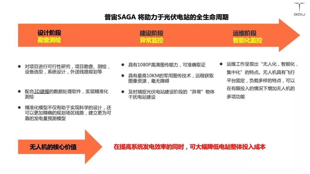从设计阶段的通过3D建模实现精准化测绘,从而实现系统设计和项目勘察;到电站建设阶段通过1080P的高清图传,对异常现象进行准确取证;再到电站运维阶段“无人化、智能化、集中化”的智能化监控。普宙飞盟平台SAGA将赋能于光伏电站的全生命周期。