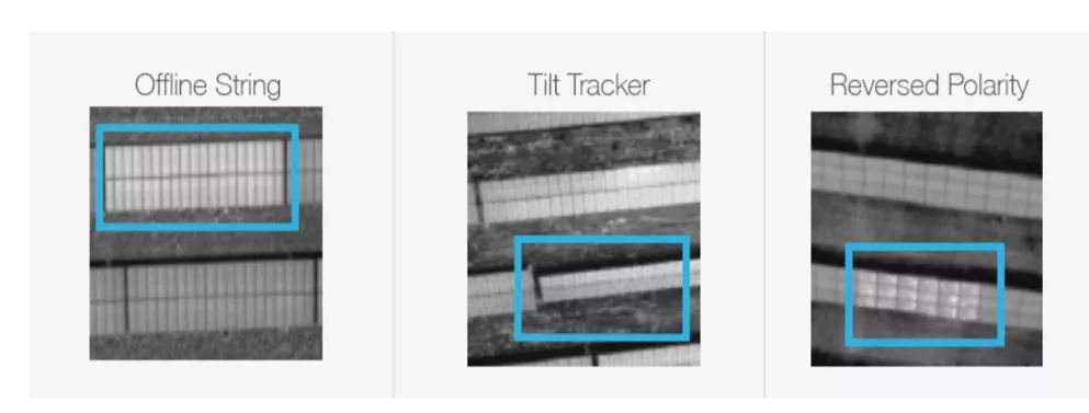 常见的异常,除了以上图示外,还包括:通过检测缺失模组来检测违规建设(需结合电站规划图),气温、冰雹、洪水、台风等破坏,在热能或放射性、红绿蓝影像里出现的分层及其他潜在模组异常。其他诸如组件灰尘检测、组件热斑检测、组件遮挡检测、组件污垢检测、组件裂痕检测、组件不发电检测、组件防反二极管损坏检测,组件背板划伤以及汇流箱发热等设备故障、隐患也能精确地检测出来。