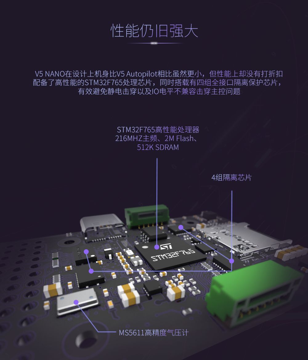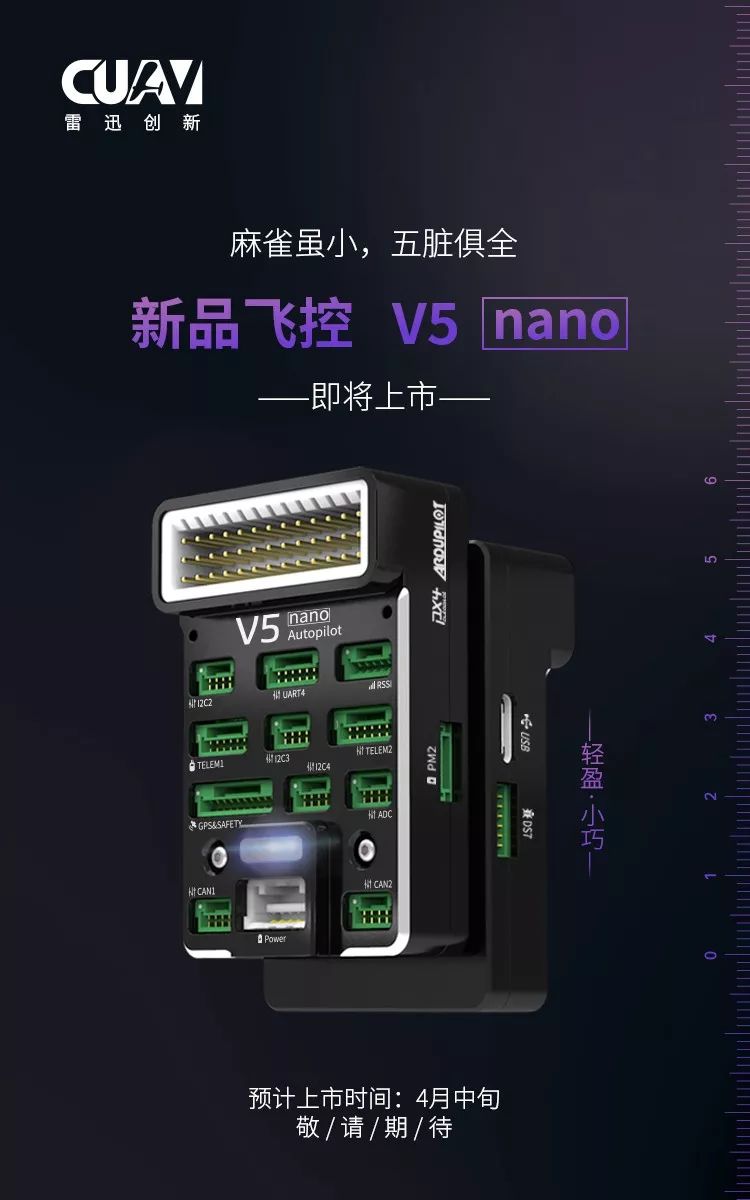 为了适应用户对无人机重量更轻,性能上更高的要求,CUAV研发了新一代飞行控制系统,新款飞控在外型上更小,减少了无人机有限的空间的占用,更轻的重量,让无人机能轻装出发。因此,将其命名为:V5 nano