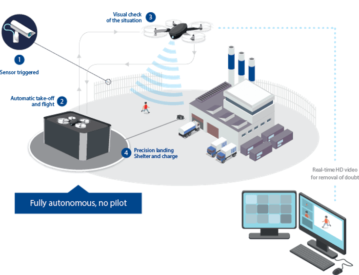 Skeyetech无人机可以在远程操作员的简单监督下,在城市地区白天或夜晚飞越超视距Beyond Visual Line of Sight(BVLOS)。通过这一独特的批准,该系统将由没有飞行员执照的保安直接操作。因此,无人机将用于巡逻一个区域或在发生警报时提供有价值的空中洞察。
