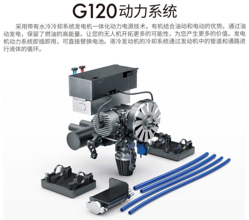在中国有数百家无人机制造商,其中大部分都从事工业级无人机生产和服务,他们所生产和选择的无人机又以电动无人机为主,续航30多分钟和载荷3kg左右成为主打产品。然而,这样的续航和负载能力已经逐渐的无法满足更多的应用拓展,大载荷和长续航的无人机已经成为众多用户以及无人机制造商迫切得到产品。近年来,大功率油电混合发动机一直都是某些无人机制造商所期待的产品之一。G120油电混合动力系统适用于多种不同机型,超强的动力输出可达到15-24kg的负载能力,无论是农业植保还是长航时巡检、航拍等皆可可满足。