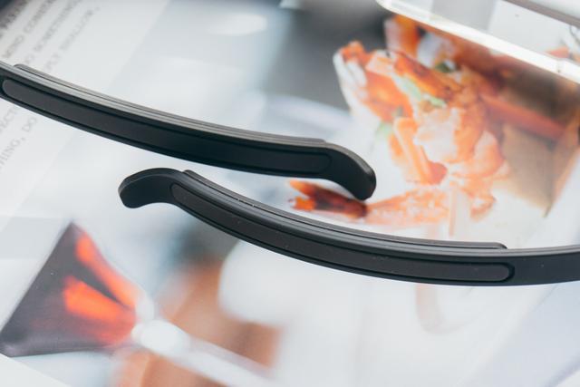 侧面角度,厚度没那么小巧了,这是因为要将显示画面投射到人眼中,势必要将反射面以45度角布置,厚度是无法减少的。
