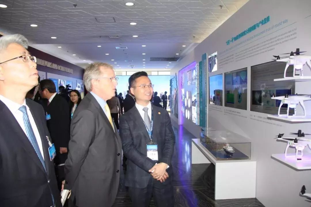 在一飞智控的展台前,南非、土耳其、尼泊尔、几内亚比绍等国家的大使详细了解了一飞智控的技术。一飞智控副总经理楚建介绍说,像尼泊尔多山地,他们对无人机物流非常感兴趣。