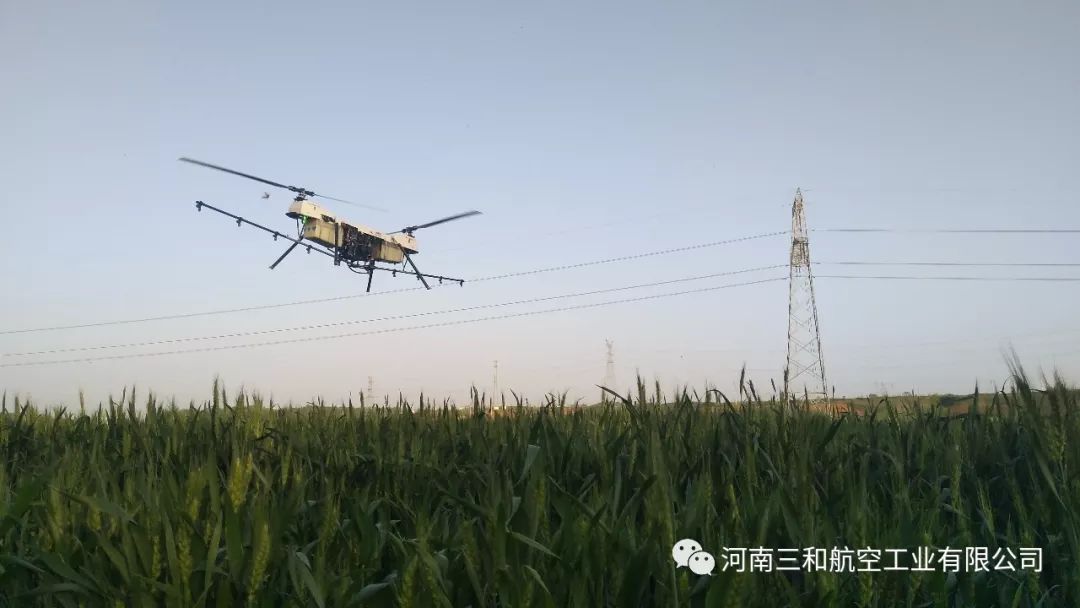 河南三和航空工业有限公司自主研发生产的植保版S50“小旋风”无人机最大载荷40公斤,一个架次10分钟可有效作业50亩以上,日作业量超过1500亩。横列双旋翼这种布局形式,目的是增加有效风场宽度,提高作业效率,大直径低转速的旋翼能提供更适合飞防作业的大而柔和的有利风场,能更好的使雾滴穿透作物到达底部及叶子的背面,减少药物漂移,实现更好的作业效果。S50“小旋风”无人机的动力系统选用了42马力的航空发动机,平均每亩油耗仅为0.35元,是一款大载荷、高效率、低成本的专业植保无人机。