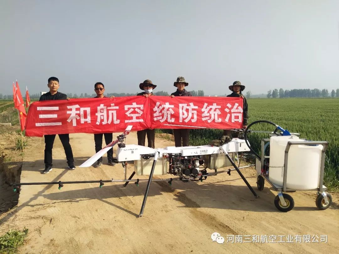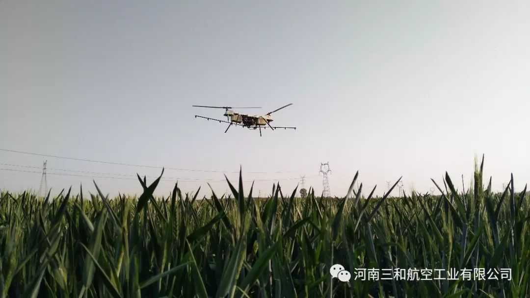 4月17日,河南三和航空工业有限公司的无人机植保团队受邀到南阳市淅川县对小麦病虫害进行统防统治,S50“小旋风”植保无人机进入田间进行实地飞行作业,横列双旋翼布局和大直径桨叶形成了大而柔和的风场,宽度15米的有效风场将农药均匀的喷洒到麦田中,在不到十分钟的飞行作业时间内,S50“小旋风”无人机就达到了50亩的作业面积,足以体现了“小旋风”无人机超高的工作效率和完美的飞防效果。