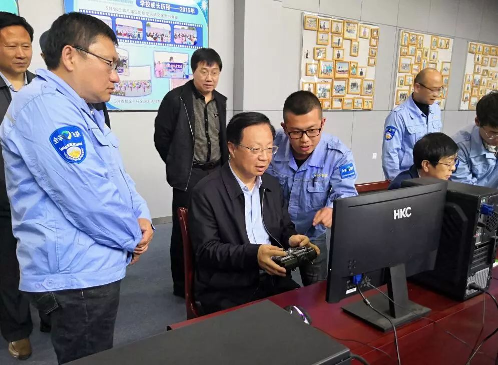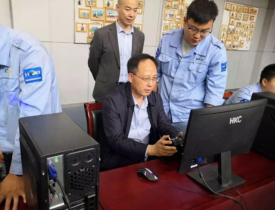 在飞行模拟室,几名新学员们正在电脑上进行模拟飞行的联系,高副主席和同行的几位领导兴致勃勃的体验了一下模拟飞行。体验后,高副主席向学员们讲到:一定认真学习专业技能,靠自己的双手和努力,提高生活水平。